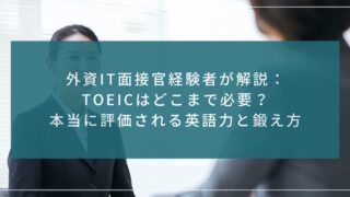 外資IT転職でTOEICはどこまで必要なのか?外資IT企業での面接官経験者が、採用プロセスにおけるTOEICの位置づけや、面接で本当に評価される英語力について具体的に解説します。さらに、TOEICを英語力の「土台づくり」に活用しつつ、適切なタイミングで英会話にシフトするなど、面接突破につながる効果的な英語学習方法も紹介します。